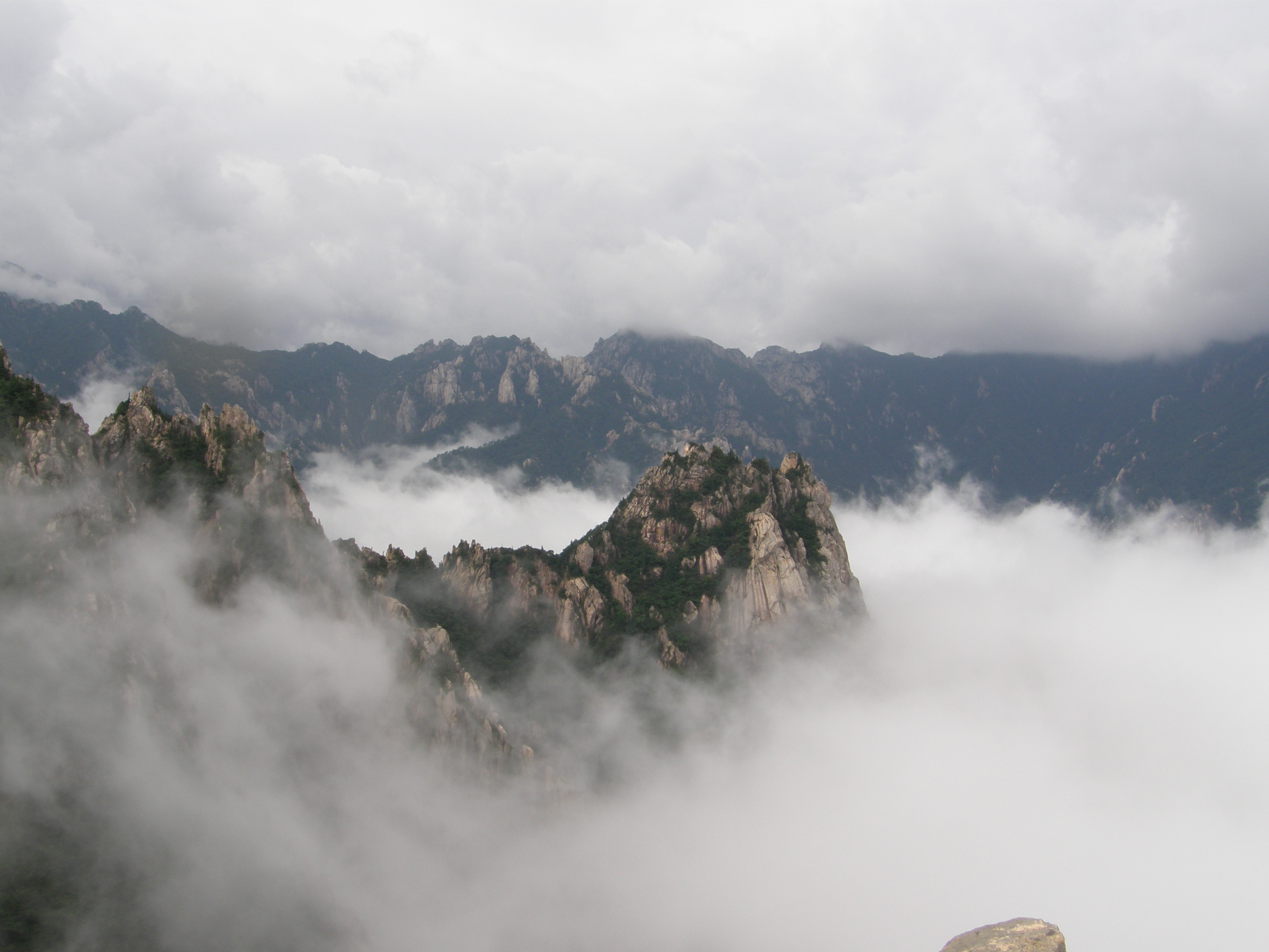 In den Bergen über besagtem Tal thronte einst die 權金城 권금성 Gwongeumseong Festung. Die Festung stammt wohl aus dem 13. Jahrhundert, aber allzu viel ist davon nicht mehr zu sein. Der Aufstieg zur Festungsruine ist steil und mühsam, aber heute braucht man mit der Seilbahn dorthin keine 7 Minuten. Die Hin- und Rückfahrkarte kostet 8’500 Won. Einmal oben angekommen, kann man dort auf gut ausgeschilderten Wegen etwas durch die Berglandschaft laufen und sogar einen kleinen Gipfel, leicht zu erkennen an der südkoreanischen Flagge drauf, erklettern. Die Aussicht von dort ist, so das Wetter mitspielt, grandios – man kann bis zum Pazifik und Sokcho schauen, aber am atemberaubendsten ist die Bergwelt des Seoraksan mit schroffen Graten und riesengrossen, runden Felsen. Traumhafte Berglandschaften gibt es viele in Japan und Korea, aber Seoraksan ist etwas besonderes und sollte bei keinem Sokcho-Besuch fehlen.