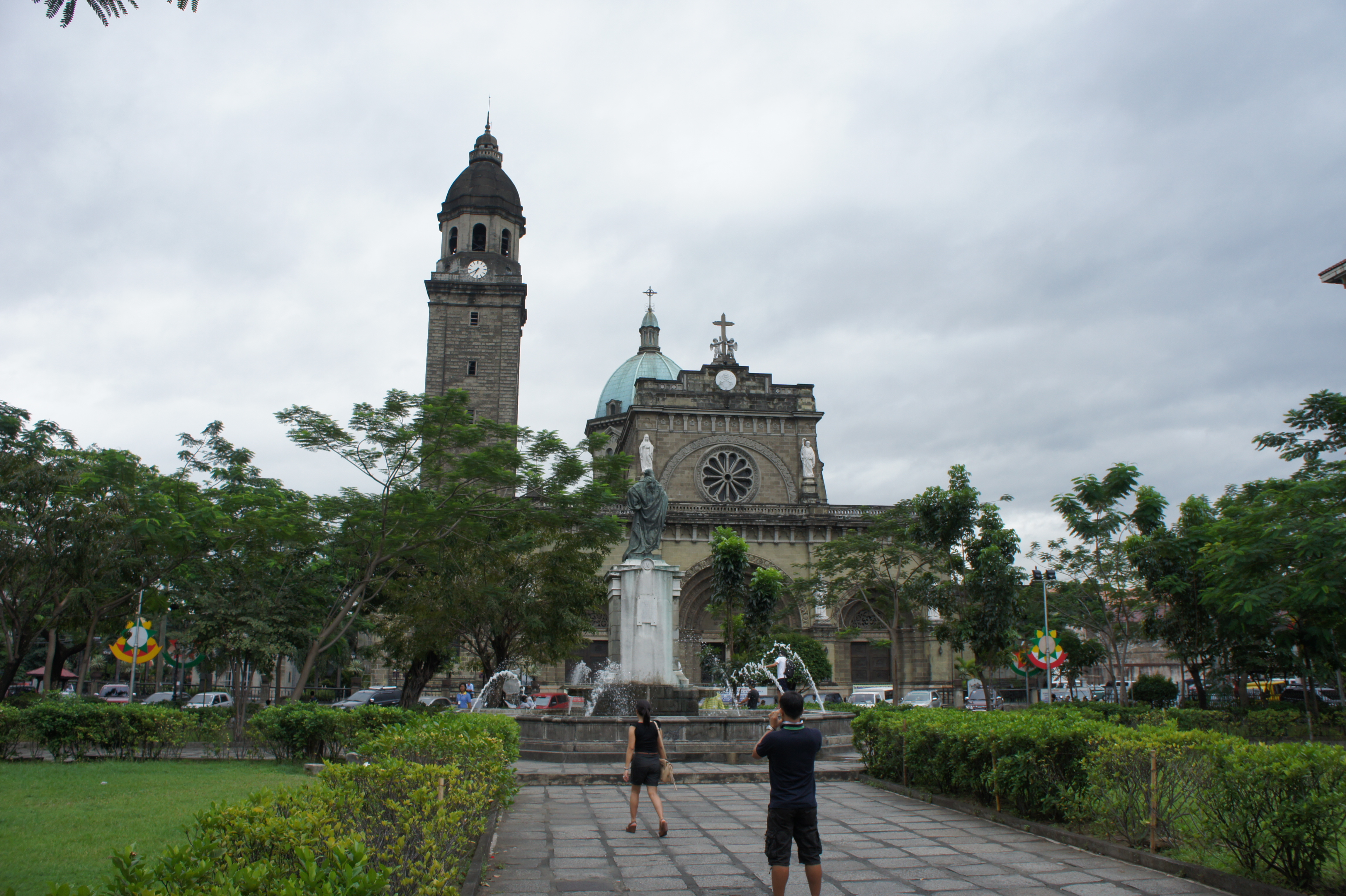 Im Nordwesten von Intramuros werden die Gebäude etwas grösser: Hier steht zum Beispiel die Kathedrale von Manila. Die Kathedrale wurde 1581 fertiggestellt, doch etliche Erdbeben und Kriege zerstörten das Bauwerk immer wieder, so dass man die Kathedrale bis heute immerhin 8 Mal wieder aufbauen musste. Man hat inzwischen dazugelernt und die Glocken aus dem Turm entfernt, denn diese waren die Hauptursache für die oft verheerenden Erdbebenschäden. Die Kathedrale ist der Jungfrau Maria gewidmet – jene ist die Schutzpatronin der überwiegend katholischen Philippinen. Seit Jahrhunderten ist die Kathedrale Sitz der Erzdiözese Manila. Vor der Kathedrale befindet sich ein kleiner, grüner und gut gepflegter Platz namens Plaza Roma. Rechterhand steht ein großes Gebäude, das einst als Governeurssitz diente und heute hauptsächlich von der Philippinischen Landesbank genutzt wird.