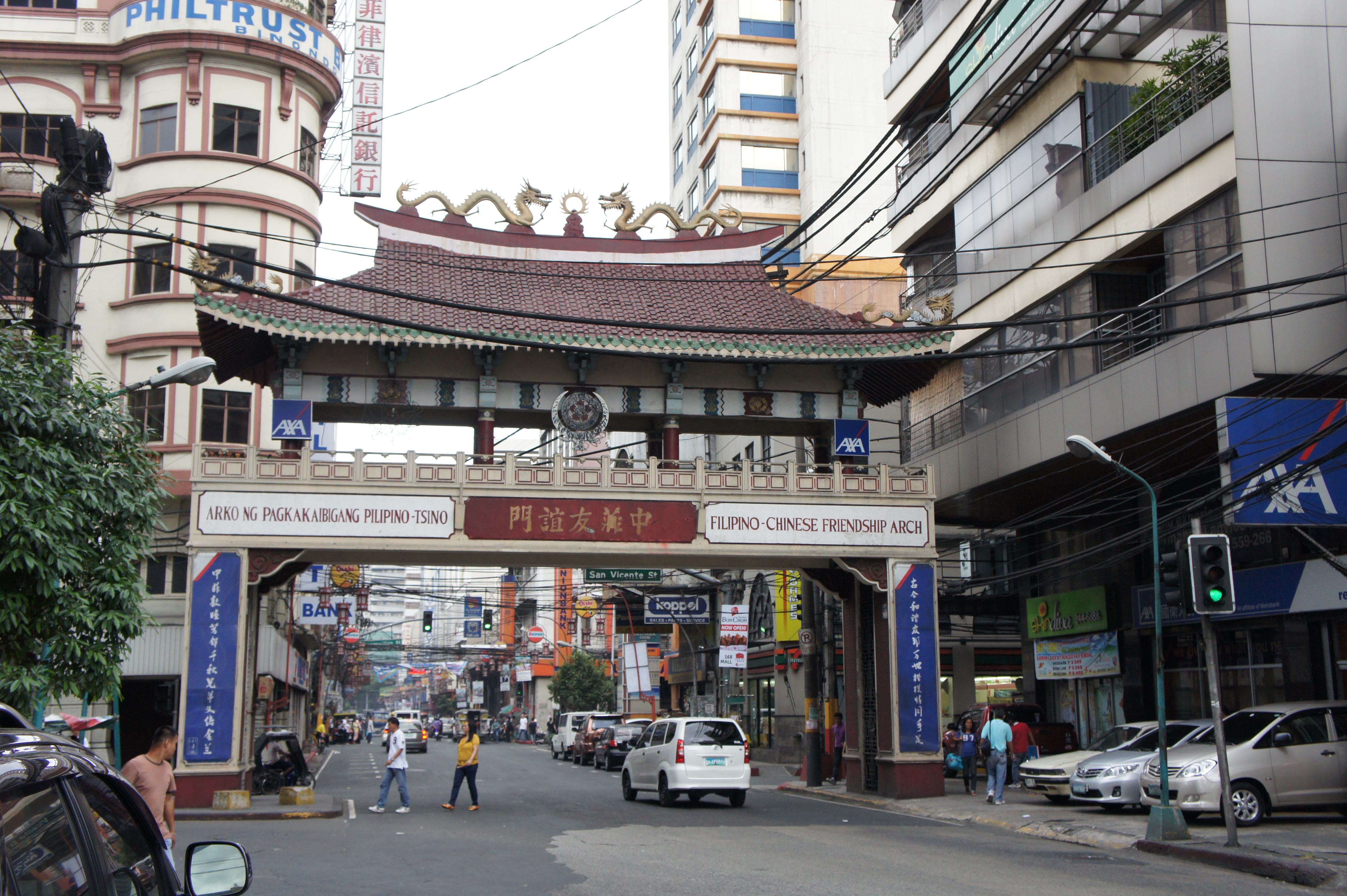 Hat man die vergleichsweise kurze und schmucklose Jones Bridge überquert, gelangt man nach wenigen Schritten zu einem großen, chinesisch anmutenden Tor mit entsprechenden Schriftzeichen drauf: 中菲友誼門 – Chinesisch-Philippinisches Freundschaftstor. Dies ist der Eingang nach Binondo – der größten Chinatown in den Philippinen, und wohl die älteste Chinatown der Welt: Das Viertel ist seit dem Ende des 16. Jahrhunderts bei chinesischen Einwanderern und deren Nachkommen beliebt. Das Viertel äußert sich – typisch chinesisch – erstmal durch zahlreiche Goldhändler und Banken, mit Rot und Gold als den dominierenden Farben und vielen Schriftzeichen. Zwischen Brücke und Tor geht rechterhand eine kleine Straße ab – die Escólta. Dies war einst der “Broadway von Manila” und wird heute noch beherrscht von Banken und Versicherungsfirmen, wenngleich die Musik der Finanzwelt heute natürlich ganz woanders spielt – nämlich in Makati mit all seinen neuen Glaspalästen der Banken.